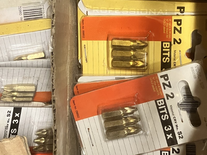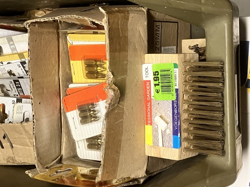 Bak met 2 dozen met bitjes op een kaart en 2 voegenborstels,