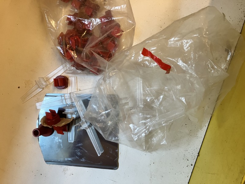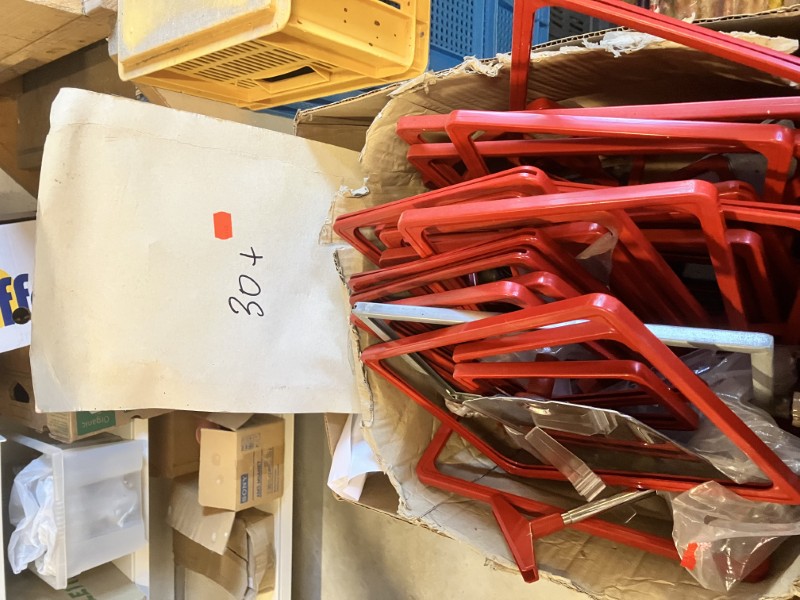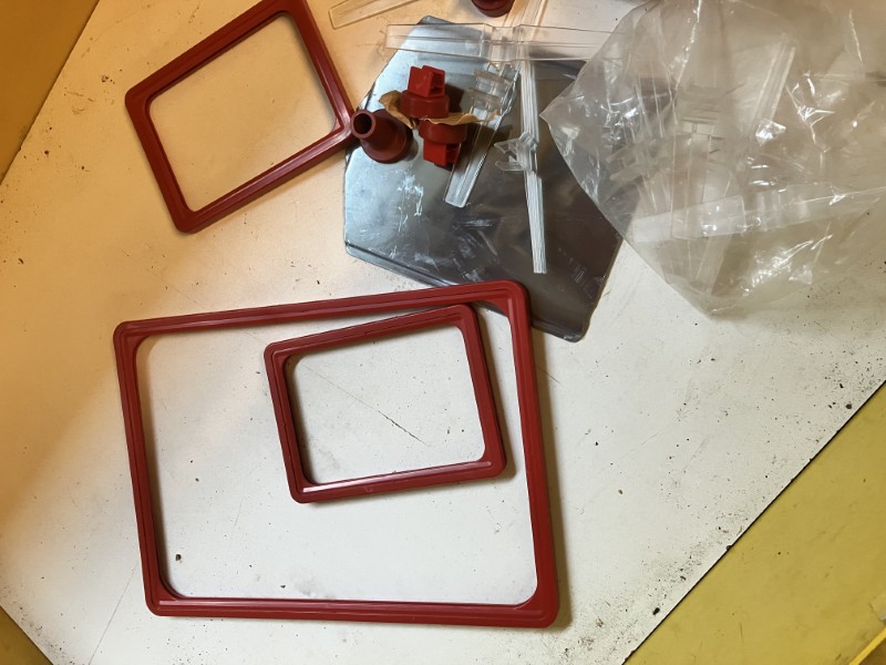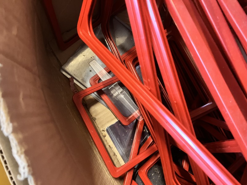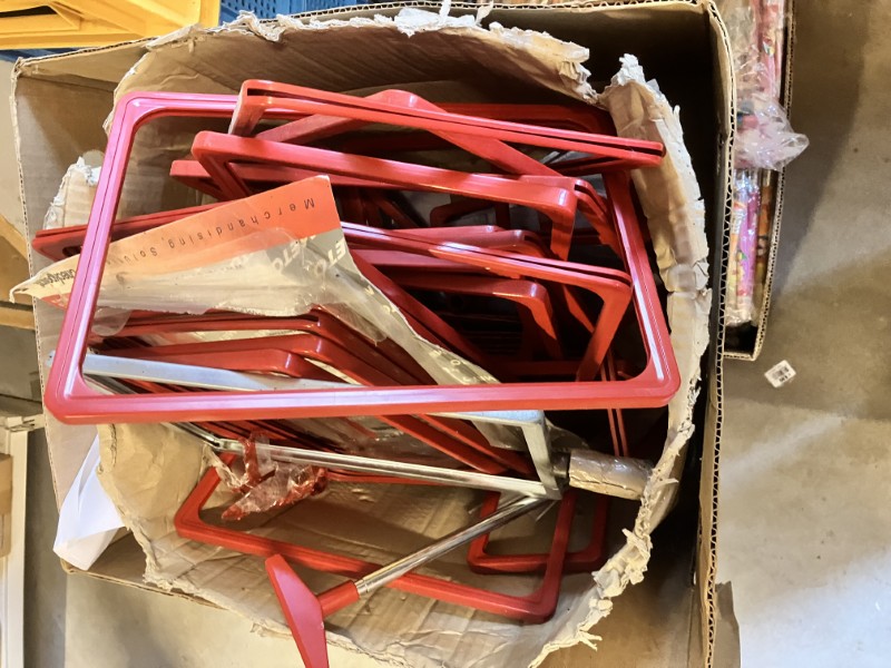 Doos met ca 30 prijskaartramen en accessoires, assorti maten, meest A4 formaat