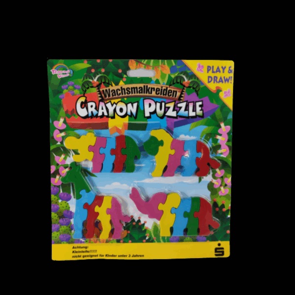 4 x Waskrijt puzzel, De vier puzzels op deze kaart zijn gemaakt van waskrijt. Ieder dier (nijlpaard, leeuw, giraffe en olifant) bestaat uit de vijf kleuren roze, blauw, rood, geel en groen. Afmetingen kaart: 21 x 23 cm (b x h).Breng een bieding uit