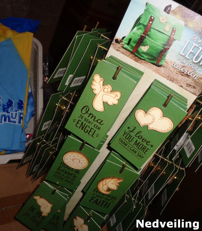 144x Houten Broches op cadeaukaart incl presentatiemolen