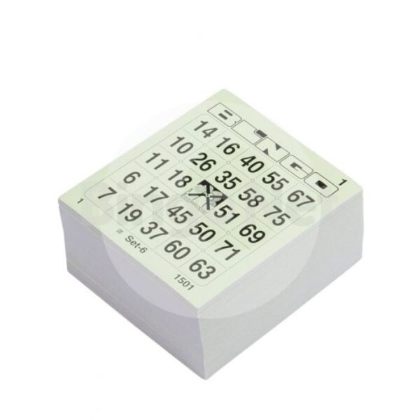 3 x Bingo blokje nummer 1-75, Bingo blokje met 5 verschillende kleuren om de ronde aan te geven. Elk pak bevat 100 ticketboekjes (1 tickets per vel) van 5 blaadjes in 5 verschillende kleuren. De boekjes zijn geschikt voor het spelen van 5 bingo ronden (de blaadjes zijn voorzien van een rondenummer) De kleurvolgorde van het boekje is als volgt: L. groen, Chamois, Blauw, Rosa en Wit.Breng een bieding uit