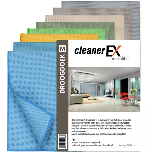 5 x Droogdoek CleanerEX microfiber, Deze CleanerEX droogdoek is te gebruiken voor alle gladde oppervlakken zoals glas, kunststof, tegels enz. Maakt streeploos droog en laat absoluut geen pluisjes achter. Apart wassen voor 1e gebruik. Gebruik geen wasverzachter en bleekmiddel. Afmeting: 61 x 46 cm. Ze worden geleverd in 5 verschillende kleuren (blauw, groen, grijs, taupe, rose),Breng een bieding uit