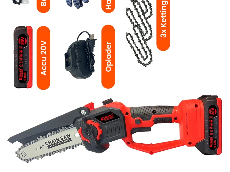 Kibani Accu Takkenzaag - Elektrische Zaag - Draadloos - Inclusief Accesoires - Mini Kettingzaag - 15 cm - Met Opbergkoffer, Omvang (B x H): 12cm x 24cm Display: Ja Meegeleverde accu: Ja Zaag snelheid: 8 M/s Verstelbaar: JaBreng een bieding uit
