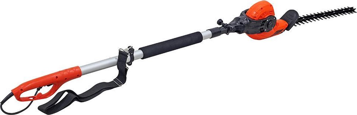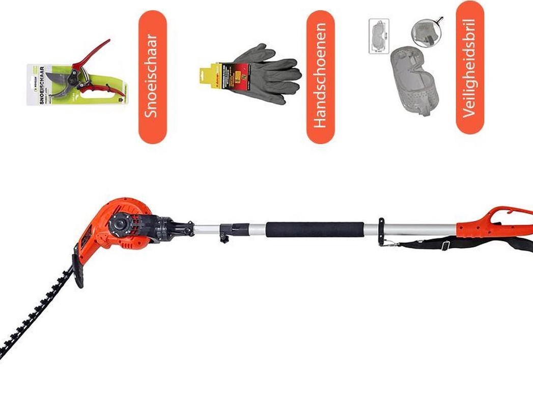 Kibani Elektrische Heggenschaar XXL - 450W – 49 cm Zwaardlengte – Telescopisch, verstelbare hoogte van 190 tot 250 cm is de telescopische heggenschaar geschikt voor heggen van elk formaat. Ook is de kop naar wens instelbaar, in een werkhoek van -60° tot +80°.Breng een bieding uit