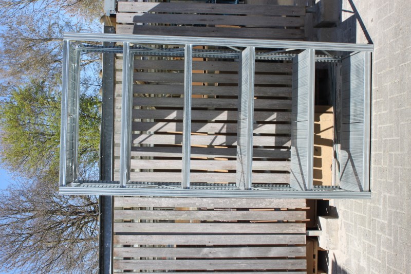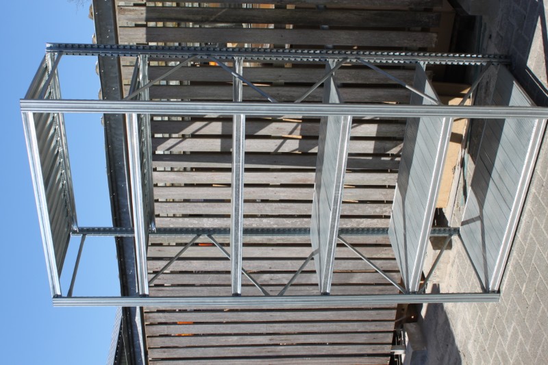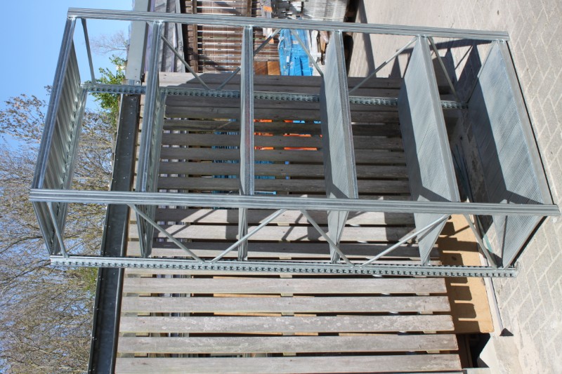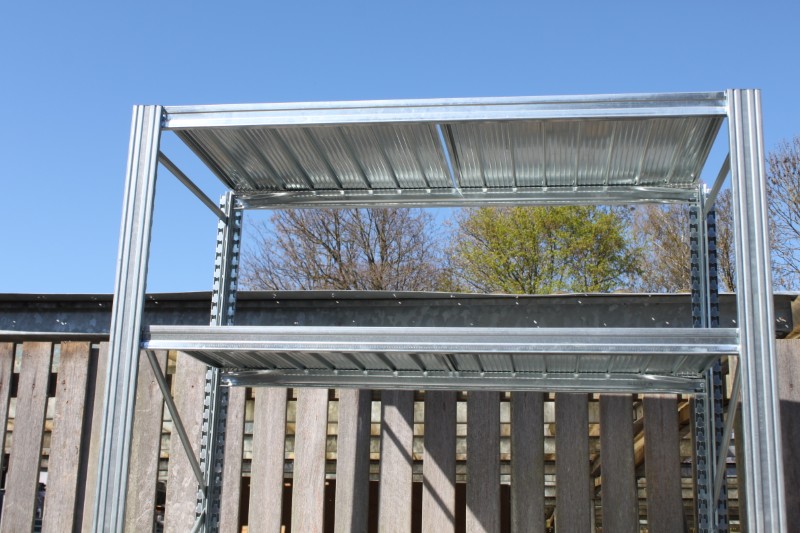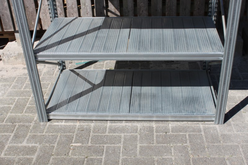 Legbord stelling, planken 60cm diep x 120 cm breed, staanders 250cm hoog, 12 meter stelling met 11 staanders.