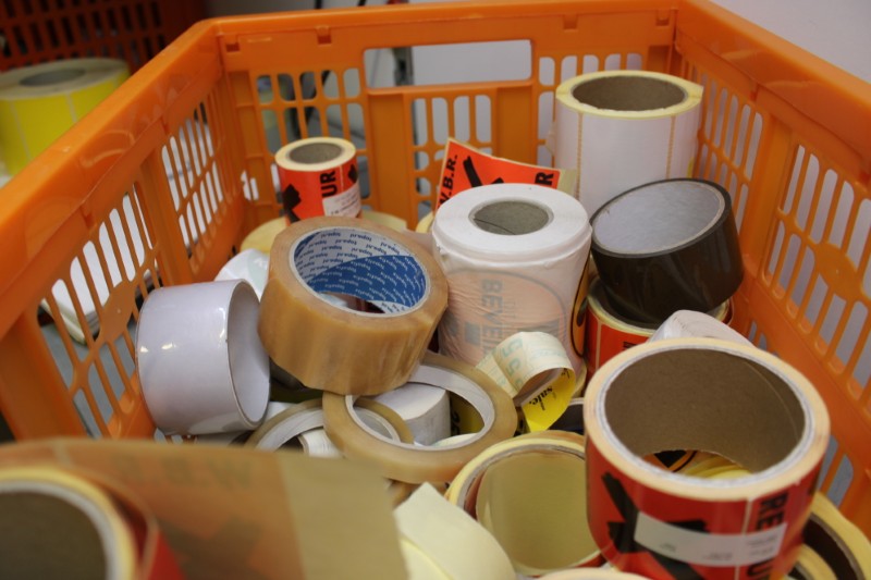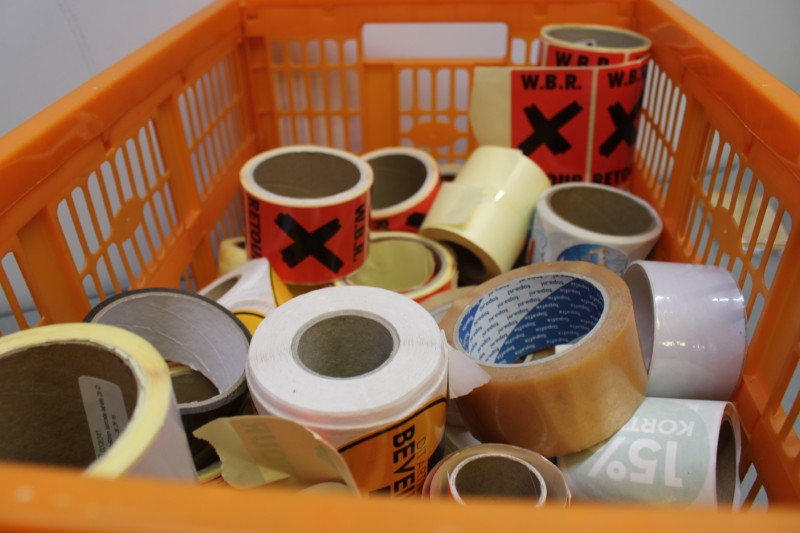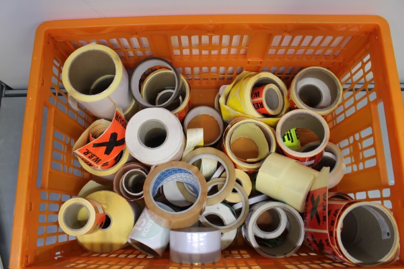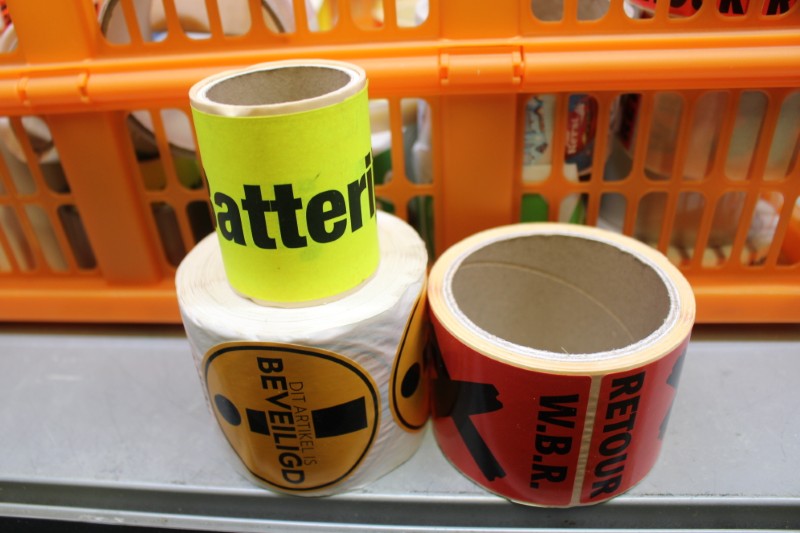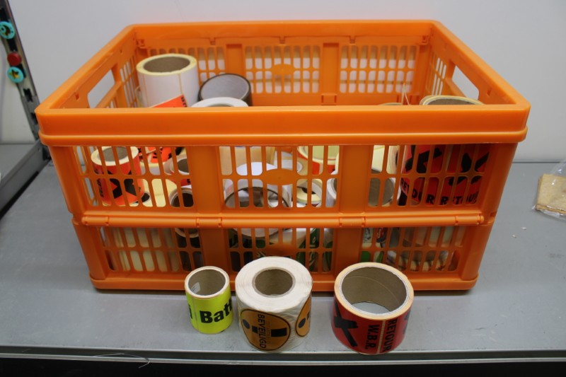 Partij magazijn stickers divers, incl krat