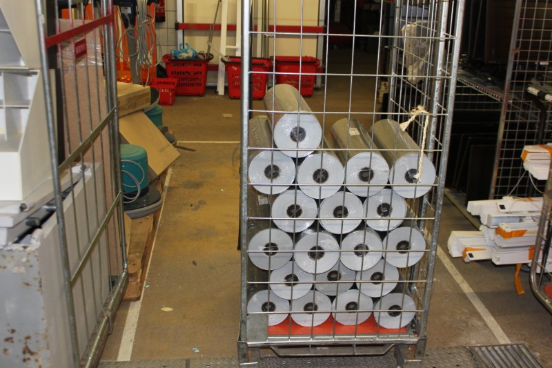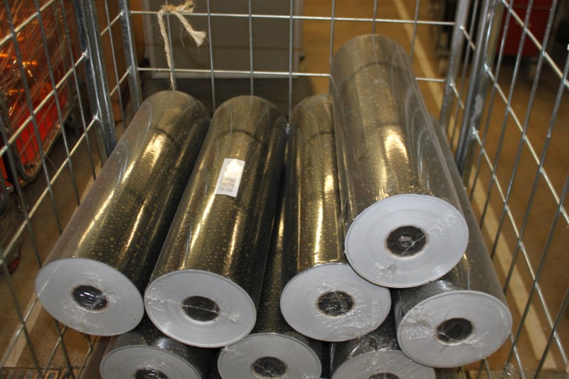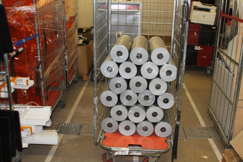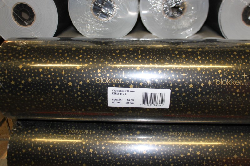 Partij rollen inpakpapier met opdruk, 21 stuks, word verkocht zonder kar.