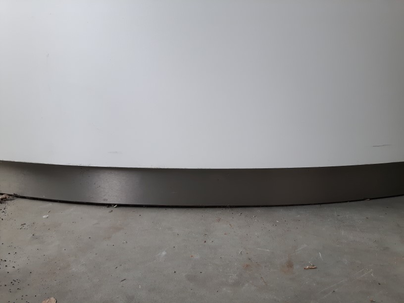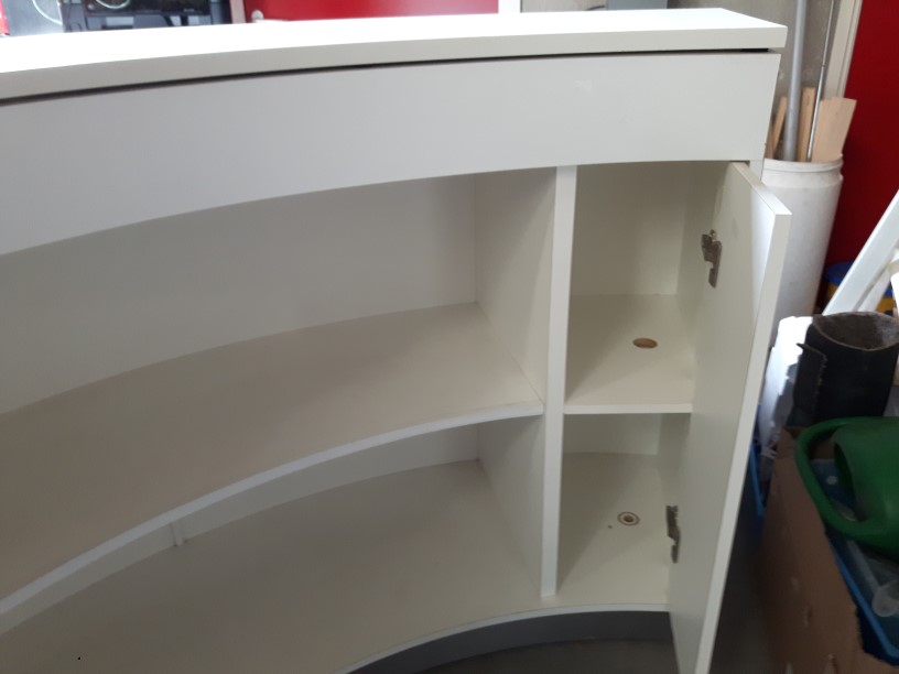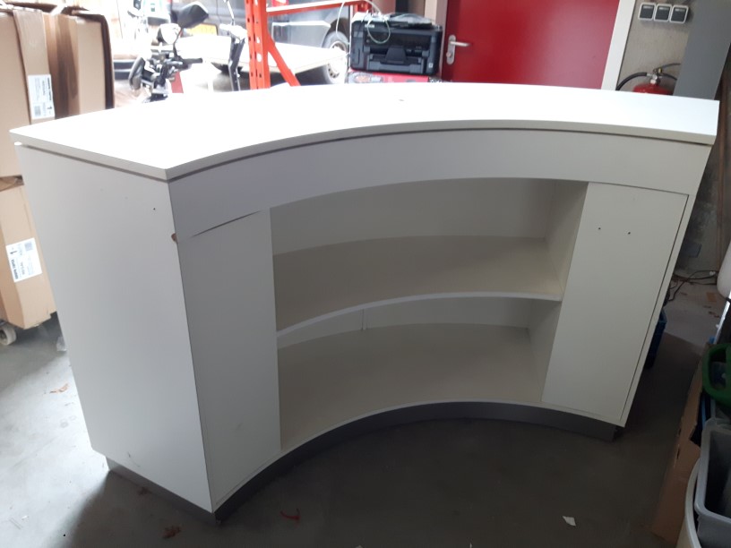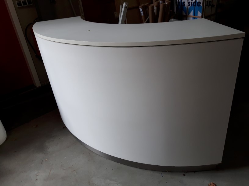 Toonbank/balie, kwart rond van multiplex bekleed met formica met een los bovenblad voor het opbergen van snoeren en computer, 1 stuk, afmeting 211,5 breed cm x 50 cm diep en 113 cm hoog, 1 x schap en 2x een deurBreng een bieding uit
