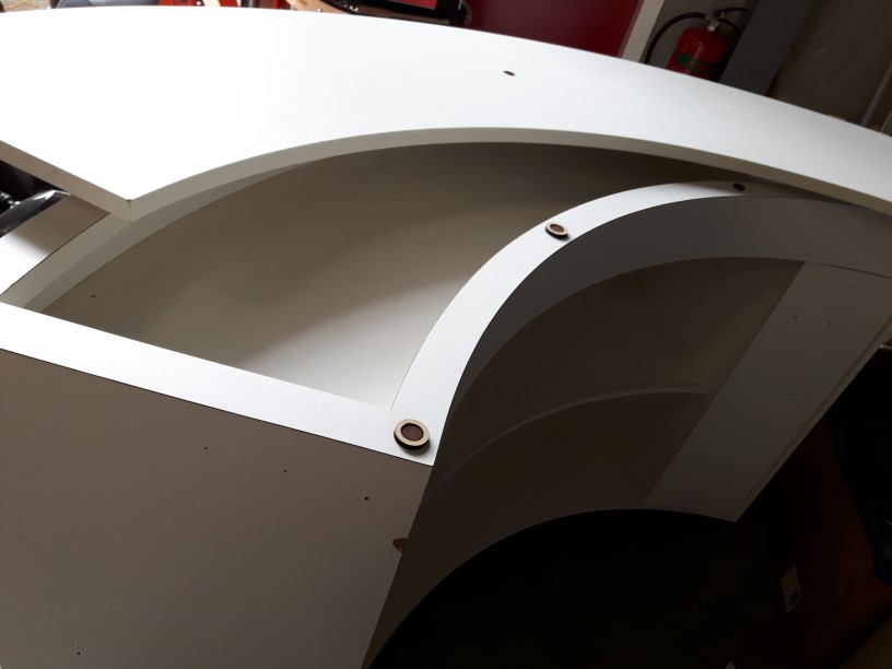 Toonbank/balie, kwart rond van multiplex bekleed met formica met een los bovenblad voor het opbergen van snoeren en computer, 1 stuk